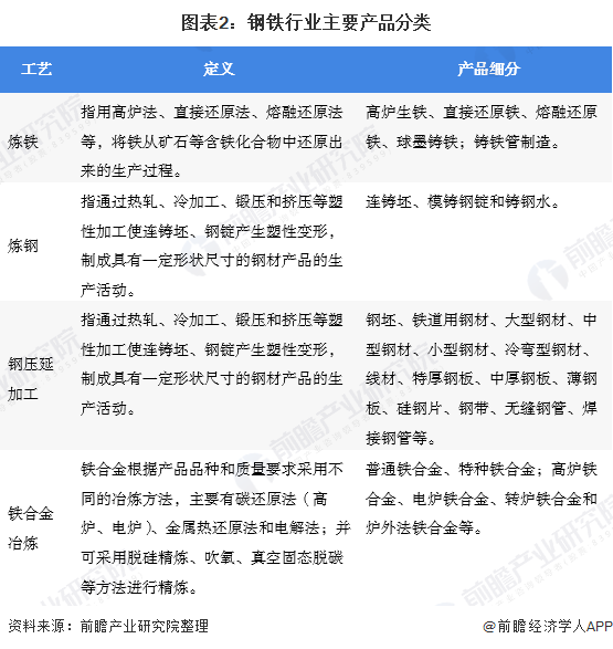钢铁产品包括生铁、粗钢、钢材等三大类,按照不同的冶炼工艺,钢铁产品又可以进一步细分:
