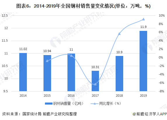 从需求规模来看,根据国家统计局数据,2014-2019年,全国钢材销售量呈波动下降后回升的趋势,其中2017年为10.31亿吨,为近几年的最低值,2019年为11.90亿吨,同比增长9.17%。