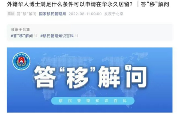 最近中国国家移民管理局在官方公众号上解答了外籍华人博士在华申请永久居留的疑问。