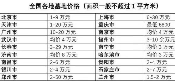 居民住宅楼从以前的几千一平到现在的几万一平,房价逐年增高,跟它一起涨价的还有墓地的价格,几万到几百万不等。以至于好多人都会玩笑的说“活不起,死不起”