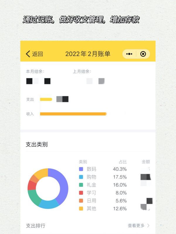 5.存钱第一步从记账开始,清楚自己每个月的钱花去哪里了,才能更好的调整与分配,控制自己,减少不必要的花销,优先生活必需开销(吃饭、交通、住房、话费等),适当的娱乐开销(网购、聚餐、电影等)