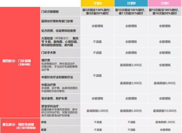 2、涵盖住院+门诊(计划C有体检、疫苗),且门诊无等待期