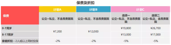 计划C:不选昂贵医院,0-7岁,19800元,8-17岁,13000元;选择昂贵医院,0-7岁,26700元,8-17岁,17000元
