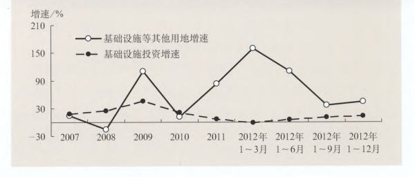 基础设施投资增速回升。自2010年起基础设施投资增速回落,2012年第一季度基础设施建设投资增速更是同比下降2.1%,第二季度出现好转,投资增速由负转正,上半年基础设施投资同比增长4.4%,前三季度基础设施同比增长10.2%,全年增长13.3%(图3-1)。从2010年开始各地部署了大量的基础设施建设项目,但从目前的投资情况看,资金的增速滞后于供地的增速。基础设施建设资金主要来自地方政府和民间投资,2011年国有及国有控股投资比重为35.6%,2006年中央财政所占比例15%左右。近两年,地方政府深陷债务危机,同时由于宏观调控政策的影响,2011年以来,建设基础设施、地方政府偿还债务的重要资金来源,土地出让收入锐减。在这种情况下,需要密切关注,加强分析,避免用地的无序扩张,保证用地的节约集约。