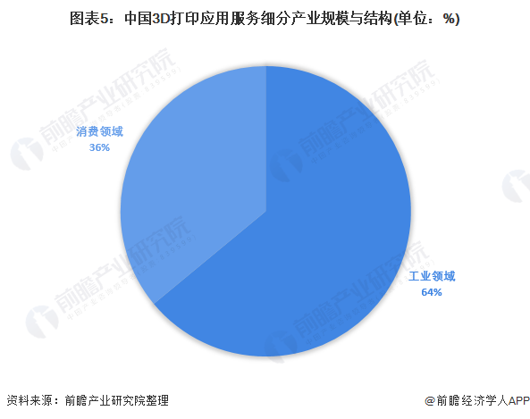 从服务领域来看,目前3D打印服务主要集中于工业领域,特别是航空航天、汽车、工业制造等,占比超过60%;消费领域占比约为36%。