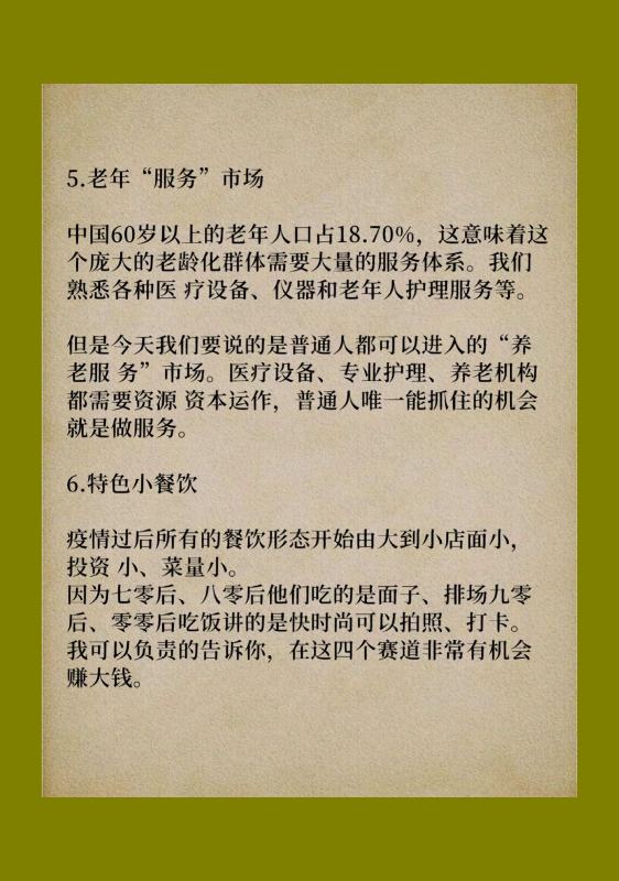 因为七零后、八零后他们吃的是面子、排场九零后、零零后吃饭讲的是快时尚可以拍照、打卡。我可以负责的告诉你,在这四个赛道非常有机会赚大钱。