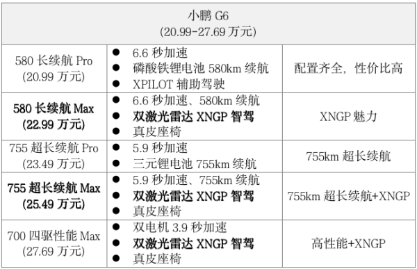 小鹏G6共有5款配置车型,售价区间20.99-27.69万元,各车型之间主流的配置均有配备,主要差异在于动力、续航、智能驾驶辅助,在这方面规避了此前犯过的SKU过多的错误,让用户更容易选择。