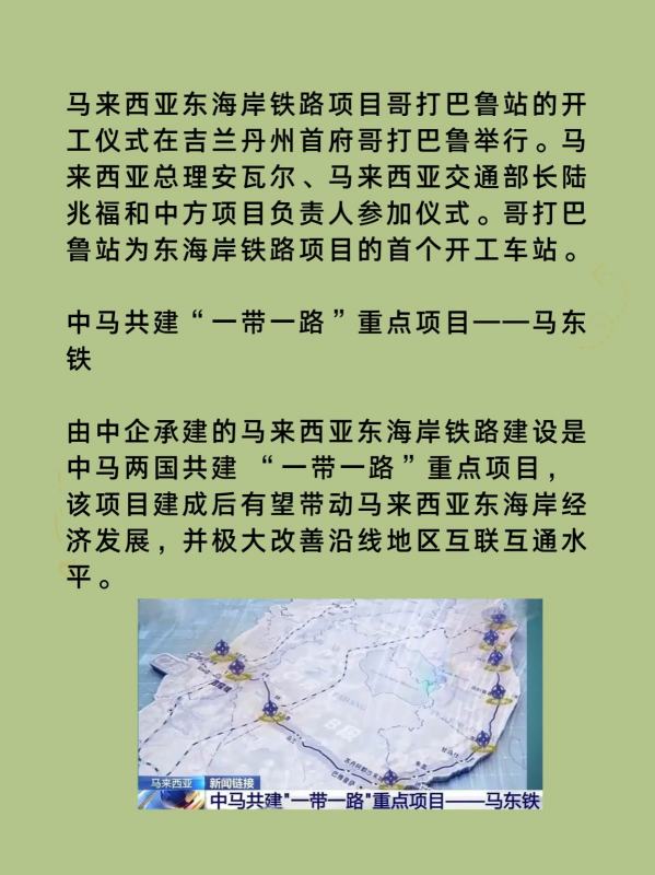 马来西亚东海岸铁路项目哥打巴鲁站的开工仪式在吉兰丹州首府哥打巴鲁举行。马来西亚总理安瓦尔、马来西亚交通部长陆兆福和中方项目负责人参加仪式。哥打巴鲁站为东海岸铁路项目的首个开工车站。