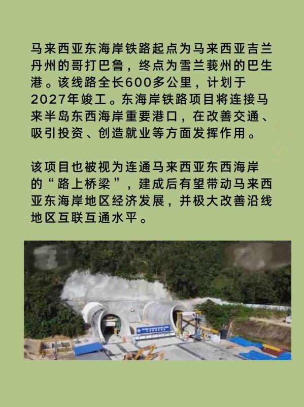马来西亚东海岸铁路起点为马来西亚吉兰丹州的哥打巴鲁,终点为雪兰莪州的巴生港。该线路全长600多公里,计划于2027年竣工。东海岸铁路项目将连接马来半岛东西海岸重要港口,在改善交通、吸引投资、创造就业等方面发挥作用。