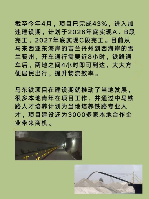 截至今年4月,项目已完成43%,进入加速建设期,计划于2026年底实现A、B段完工,2027年底实现C段完工。目前从马来西亚东海岸的吉兰丹州到西海岸的雪兰莪州,开车通行需要近8小时,铁路通车后,两地之间4小时即可到达,大大方便居民出行,提升物流效率。