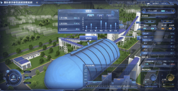 展示了厂区所有建筑用能、重要设备或工艺的能源消耗。点选内场景建筑图标,可以清晰明了地看出对应建筑当日及一周内用水、用电、用气的累计值以及变化趋势,能源管理一键触达。
