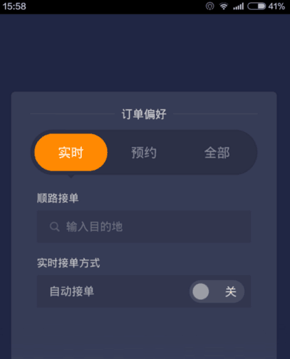 在屏幕下方还有个模式按钮,点击后弹出如下对话框,可以听单模式进行设置。实时单就是正在发生的打车单,预约就是有乘客提前约好时间的打车单。