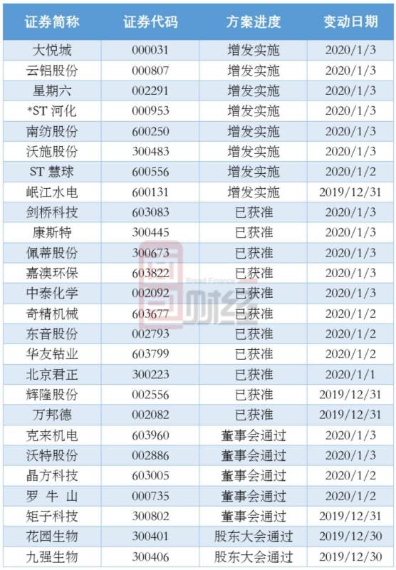 大悦城(000031)实施非公开发行,总发行数量36044.30万股,发行价格6.73元/股,募资总额242578.14万元。发行对象为募集资金发行对象为太平人寿保险有限公司、工银瑞信投资管理有限公司。云铝股份(000807)实施非公开发行,总发行数量52136.78万股,发行价格4.10元/股,募资总额213760.78万元。发行对象为发行股份募集资金发行对象为中国铝业股份有限公司、中央企业贫困地区产业投资基金股份有限公司、睿远基金管理有限公司、财通基金管理有限公司。星期六(002291)实施非公开发行,总发行数量7967.38万股,发行价格5.64元/股,募资总额44936.00万元。发行对象为配套融资发行对象为:财通基金安吉96号单一资产管理计划、财通基金安吉98号单一资产管理计划、常州投资集团有限公司、上海柒凛企业管理咨询合伙企业(有限合伙)、杨凯飞、黄豪。*ST河化(000953)实施非公开发行,总发行数量4620.07万股,发行价格3.50元/股,募资总额16170.24万元。发行对象为购买资产发行对象为何卫国、何建国。南纺股份(600250)实施非公开发行,总发行数量1408.45万股,发行价格5.68元/股,募资总额8000.00万元。发行对象为募集配套资金发行对象为南京旅游集团有限责任公司。沃施股份(300483)实施非公开发行,总发行数量2125.49万股,发行价格28.70元/股,募资总额61001.44万元。发行对象为购买资产发行对象为西藏科坚企业管理有限公司、西藏嘉泽创业投资有限公司。ST慧球(600556)实施非公开发行,总发行数量133166.67万股,发行价格3.00元/股,募资总额399500.00万元。发行对象为购买资产发行对象为Show World Hong Kong Limited、WB Online Investment Limited、北京利兹利投资合伙企业(有限合伙)、深圳庥隆金实投资管理中心(有限合伙)等共计15名交易对方。岷江水电(600131)实施非公开发行,总发行数量60322.11万股,发行价格5.56元/股,募资总额335390.93万元。发行对象为购买资产发行对象为国网信息通信产业集团有限公司、龙电集团有限公司、西藏龙坤信息科技合伙企业(有限合伙)。11家定增获准统计期内,11家上市公司定增获准(发审委审核通过或证监会核准等):剑桥科技(603083,股吧)(603083)、康斯特(300445,股吧)(300445)、佩蒂股份(300673,股吧)(300673)、嘉澳环保(603822,股吧)(603822)、中泰化学(002092,股吧)(002092)、奇精机械(603677,股吧)(603677)、东音股份(002793,股吧)(002793)、华友钴业(603799,股吧)(603799)、北京君正(300223,股吧)(300223)、辉隆股份(002556,股吧)(002556)、万邦德(002082,股吧)(002082)。