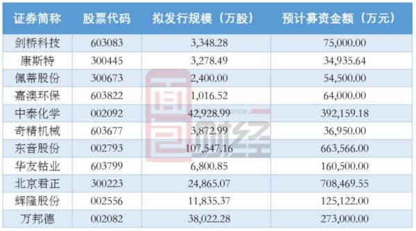 剑桥科技(603083):预计募资(不超过)75000.00万元。预计募资投向:1、高速光模块及5G无线通信网络光模块项目;2、补充流动资金。康斯特(300445):预计募资(不超过)34935.64万元。预计募资投向:1、压力温度检测仪表智能制造项目;2、智能校准产品研发中心项目。佩蒂股份(300673):预计募资(不超过)54500.00万元。预计募资投向:1、新西兰年产4万吨高品质宠物干粮新建项目;2、柬埔寨年产9,200吨宠物休闲食品新建项目;3、城市宠物综合服务中心建设项目;4、补充流动资金。嘉澳环保(603822):预计募资(不超过)64000.00万元。预计募资投向:1、本公司以发行股份及支付现金的方式购买江阴华昌食品添加剂有限公司100%股权;2、本次募集配套资金拟用于江阴华昌子公司年产1 万吨牛磺酸建设项目、支付本次交易涉及的现金对价、支付本次交易税金及中介机构费用。中泰化学(002092):预计募资(不超过)392159.18万元。预计募资投向:(1)中泰化学吐鲁番市托克逊县高性能树脂产业园及配套基础设施建设项目;(2)中泰化学托克逊年产200万吨电石项目二期工程。奇精机械(603677):预计募资(不超过)36950.00万元。预计募资投向:1、年产430万套波轮洗衣机离合器扩产项目;2、年产1,350万件汽车动力总成关键零部件扩产项目;3、补充流动资金。东音股份(002793):预计募资(不超过)663566.00万元。预计募资投向:本公司拟发行股份购买公司除保留2.6791亿元的货币现金、可转债外,在扣除公司2018年度现金分红后不超过10亿元的其余资产及负债与山东罗欣药业集团股份有限公司99.65476%股权置换后差额部分。华友钴业(603799):预计募资(不超过)160500.00万元。预计募资投向:本公司拟发行股份购买衢州华友钴新材料有限公司15.68%股权;配套融资用于衢州华友钴新材料有限公司“年产3万吨(金属量)高纯三元动力电池级硫酸镍项目”和支付中介机构费用及本次交易相关税费。北京君正(300223):预计募资(不超过)708469.55万元。预计募资投向:1、本公司拟发行股份及支付现金购买北京矽成半导体有限公司59.99%的股权及上海承裕资产管理合伙企业(有限合伙)100%的财产份额;2、配套募集金额拟用于支付本次交易的部分现金对价、面向智能汽车的新一代高速存储芯片研发项目、面向智能汽车和智慧城市的网络芯片研发项目。辉隆股份(002556):预计募资(不超过)125122.00万元。预计募资投向:一、本公司拟发行股份购买安徽海华科技有限公司73.33%股权;二、配套融资用于1、支付本次交易现金对价;2、海华科技1000t/a百里香酚,3000t/a薄荷醇项目;3、支付本次交易的中介机构费用;4、偿还债务及补充流动资金。万邦德(002082):预计募资(不超过)273000.00万元。预计募资投向:购买万邦德制药集团股份有限公司100%股权。7家披露定增预案及更新定增进度统计期内,克来机电(603960,股吧)(603960)、沃特股份(002886,股吧)(002886)、晶方科技(603005,股吧)(603005)、罗 牛 山(000735)、矩子科技(300802)等5家披露了增发预案,花园生物(300401,股吧)(300401)、九强生物(300406,股吧)(300406)2家增发获股东大会通过。克来机电(603960):预计募资(不超过)11715.80万元。预计募资投向:1、本公司拟发行股份及支付现金购买南通克来凯盈智能装备有限公司35%股权;2、募集配套资金用于上海众源“国六b汽车发动机EA888高压燃油分配管制造及新能源车用二氧化碳空调管路组装项目”建设以及支付中介机构费用。沃特股份(002886):预计募资(不超过)43000.00万元。预计募资投向:1、特种工程塑料聚酰胺10,000吨/年、特种工程塑料聚砜10,000吨/年项目(一、二期);2、补充流动资金。晶方科技(603005):预计募资(不超过)140226.00万元。预计募资投向:集成电路12英寸TSV及异质集成智能传感器模块项目。罗 牛 山(000735):预计募资(不超过)248400.25万元。预计募资投向:1、罗牛山(000735,股吧)崖州15万头现代循环农业示范基地项目;2、罗牛山儋州乐满20万头生态养殖基地项目;3、罗牛山儋州大讲20万头生态养殖基地项目;4、罗牛山儋州乐贺40万头生态养殖基地项目;5、罗牛山澄迈东岭20万头生态养殖基地项目。矩子科技(300802):预计募资(不超过)8000.00万元。预计募资投向:本公司拟发行股份及支付现金购买苏州矩度电子科技有限公司25.00%股权。花园生物(300401):预计募资(不超过)106900.00万元。预计募资投向:1、年产1,200吨羊毛脂胆固醇及8,000吨精制羊毛脂项目;2、年产18吨胆钙化醇项目;3、年产3,600吨饲料级VD3粉及540吨食品级VD3粉项目;4、年产26吨25-羟基维生素D3原项目;5、年产40.5吨正固醇项目;6、年产15.6吨25-羟基维生素D3结晶项目;7、补充流动资金。九强生物(300406):预计募资(不超过)120000.00万元。预计募资投向:补充流动资金。声明:本资讯根据上市公司信披信息整理,不对任何人构成任何投资建议。如有错漏,将在获取反馈后第一时间进行查证并修正