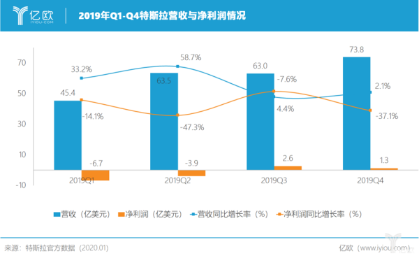 1月30日,特斯拉公布了2019财年第四季度财报。报告显示,特斯拉2019Q4营收为73.8亿美元,较去年同期的72.3亿美元增长2%。其中,特斯拉2019Q4净利润为1.3亿美元,较去年同期的2.1亿美元下滑37.1%;归属普通股股东的净利润为1.1亿美元,较去年同期的1.4亿美元下滑25%,连续两个季度实现盈利。