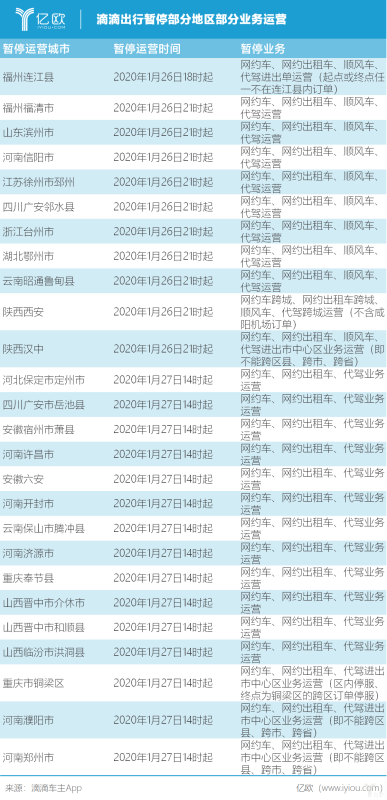 1月27日,滴滴出行在滴滴车主App中发布了《滴滴出行暂停部分地区部分业务运营》的通知。滴滴方面称,“为了做好疫情防控,应地方政府相关部门要求,滴滴出行暂停部分城市的部分业务,未提及地区(城市/区县)、业务线、订单类型暂不受影响,恢复时间以当地地方政府相关部门通告为准。”