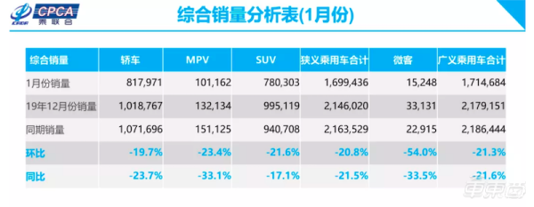 就在中汽协发布会结束后不久,乘联会也公布了2020年1月中国乘用车市场的整体情况。