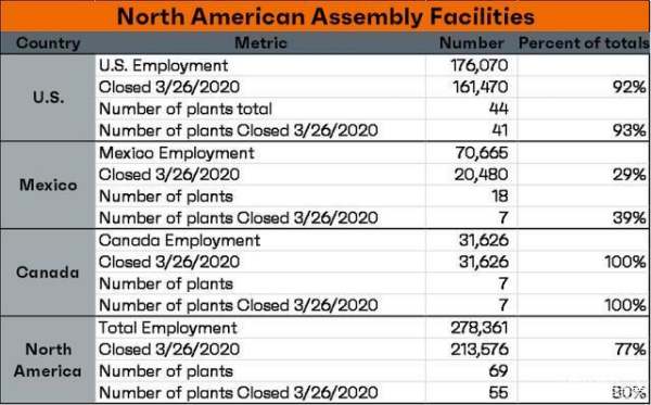 随着疫情对海外车企影响的加剧,已经停产接近半个月的海外汽车制造工厂到目前仍未达到复工条件。北美地区的69座整车厂已有55座暂时关闭停产,关闭比例达到80%;欧洲则更加严重,仅大众集团一家车企在欧洲就关停了72座工厂,复工时间也在不断推后。