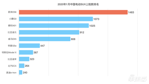 根据中汽研公布的数据,蔚来汽车1月整体上险量达到1600台。其中,蔚来ES6上险量为1483台,拿下了纯电动SUV领域的单月销量冠军。