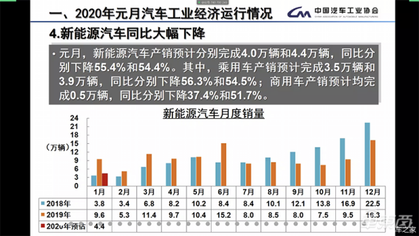 新能源汽车1月产销分别完成4.0万辆和4.4万辆,同比分别下降55.4%和54.4%。
