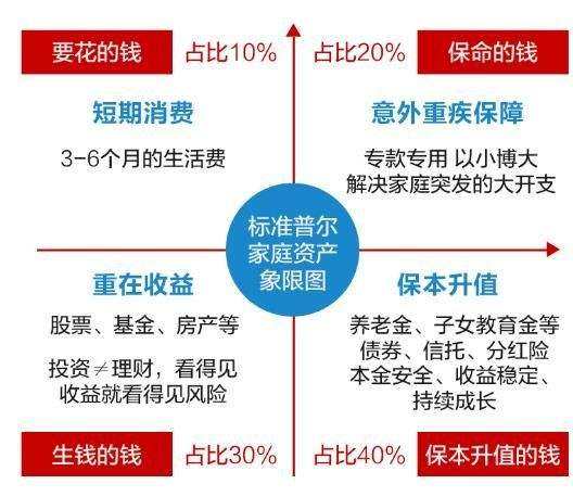生活保障:这个是很多人或很多家庭所忽视的,保障平时看不到什么作用,但是到了关键的时刻,只有它才能保障你的生活。如果没有它,您的家庭资产就随时面临风险。主要投资于用于保障的产品,重点是意外伤害、重疾保险以及(家庭支柱)人寿保险。