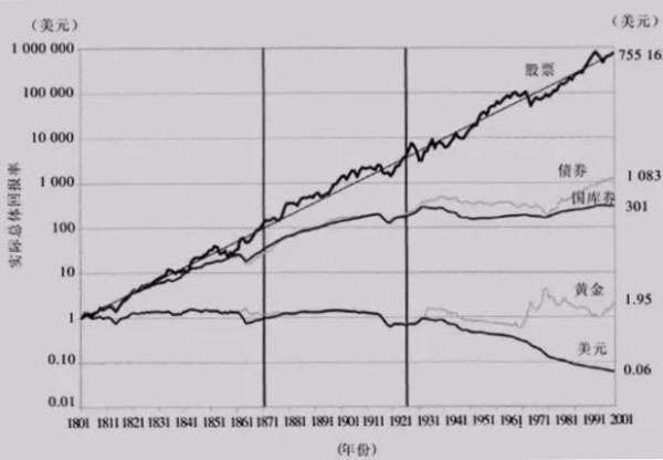 图中分别列举了用1美元购买股票、债券、黄金、现金等资产,从1801年至2001年200年间的名义总回报率。