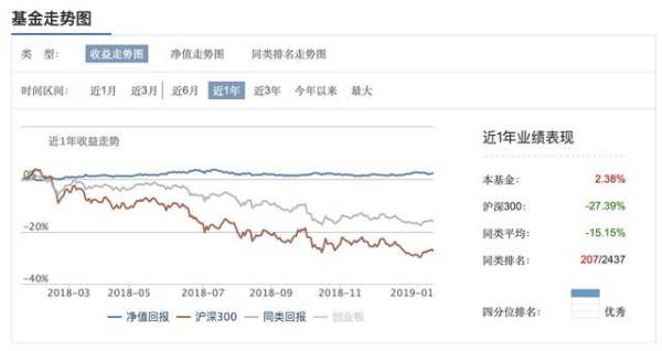上图是随便找到的一款对冲基金,我们可以看到,在沪深300近一年单边下跌的情况下,该基金还能赚取2.41%的收益。它可以以小的风险去赚股市中可能带来的较大收益。