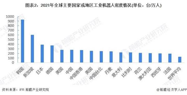 根据前瞻初步统计,2021年工业机器人密度最大的是韩国,为每万人932台,中国为每万人276台。德国和日本装机密度均排在中国之前。