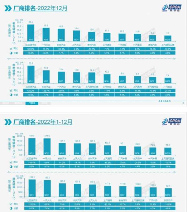 12月自主品牌零售106万辆,同比增长13%,环比增长20%。12月自主品牌国内零售份额为48.9%,同比增长3.8个百分点;1-12月累计份额47%,相对于2021年同期增长6.1个百分点。12月自主品牌批发市场份额57.5%,较去年同期份额增加10个百分点;1-12月自主品牌累计份额50%,相对于2021年同期增加6个百分点。自主品牌在新能源市场和出口市场获得明显增量,头部传统车企转型升级表现优异,比亚迪汽车、吉利汽车、长安汽车、奇瑞汽车等传统车企品牌份额提升明显。