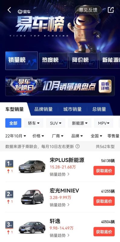 易车App提供销量、热度、点评、降价、新能源、保值率、实测、安全、零整比、保有量、经销商、易车号榜单。如需更多数据,请到易车App查看。