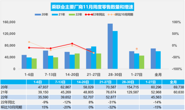 11月1-27日全国乘用车市场零售123.0万辆,同比去年下降14%,较上月同期下降15%。