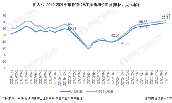 2021年9月1日,布伦特和WTI原油的月均价分别为72.09美元/桶和68.95美元/桶。纵观2020年全年,布伦特原油年均42.59美元/桶,同比下跌33.9%,WTI原油44.87美元/桶,同比下降27.1%。其主要原因是受新冠疫情、世界经济衰退、原油供需失衡等因素影响,国际市场原油价格一度暴跌,后缓慢回升。