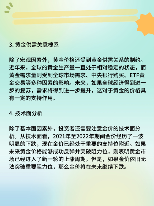 2. 货币政策的变动:全球经济与政策环境将继续推动金价的变化,尤其是各国央行货币政策方向的变动,将会对金价产生重要的影响。