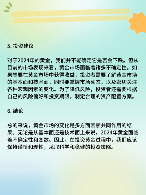总的来说,黄金市场的变化是多方面因素共同作用的结果。无论是从基本面还是技术面上来说,2024年黄金面临着不确定性和变数。因此,在投资黄金过程中,我们应该保持谨慎和理性,采取科学和稳健的投资策略。