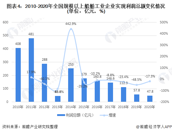 2020年全年,规模以上船舶工业企业实现利润总额47.8亿元,同比下降约17.3%。其中,船舶制造企业9.3亿元,同比下降84.3%;船舶配套企业17.4亿元,同比下降25.3%;船舶修理企业19.3亿元,同比增长13倍;船舶改装企业4.8亿元,同比增长33.3%;船舶拆除企业1.4亿元,同比下降41.7%;海工装备制造企业亏损4.2亿元,同比减亏17.3亿元;航标器材及其他浮动装置的制造企业亏损0.2亿元,与上年持平。