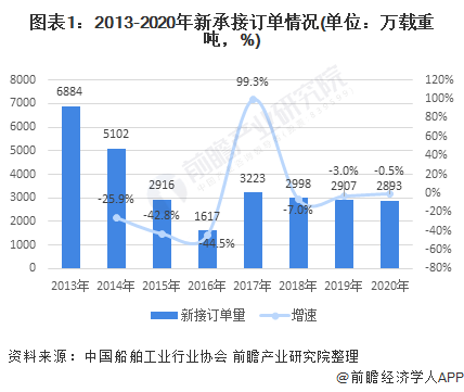 2013-2020年我国造船承接的新船订单与手持订单整体呈下降趋势。2019年,全国造船承接新船订单2907万载重吨,同比下降3.04%。12月底,手持船舶订单8166万载重吨,同比下降7.55%。