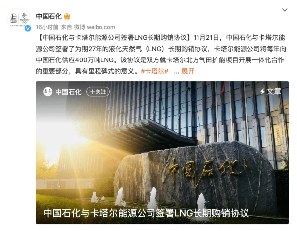 到11月21日,双方已经签署了为期27年的购销协议,这是液化天然气(LNG)交易史上最长的协议。卡塔尔能源公司负责人表示,与中石化签署的北东油田项目第一份销售和采购协议,是一个重要里程碑。双方都认识到长期交易对彼此很重要。