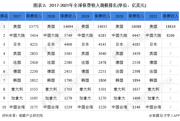 注:部分国家及地区尚未发布2021年保费收入数据。