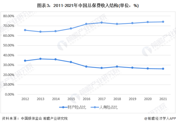 从保费收入结构上来看,2021年我国人身险保费收入为33229亿元,占比高达74%,财产险保费收入为11671亿元,占比为26%,与世界其他成熟保险市场相比,我国保险保费收入结构失衡较为严重,财产保险发展不够健全。