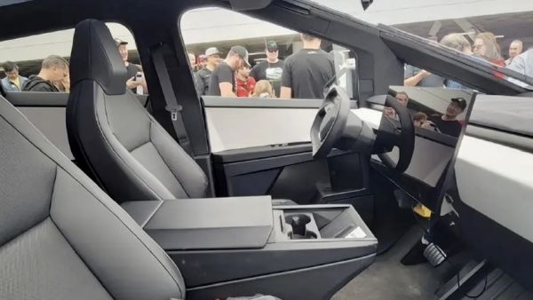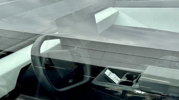 在座舱内饰方面,Cybertruck车内采用了全新造型的方向盘,方向盘的造型很像是Yoke方向盘的改进版,采用了多边形的设计,按键布局与Yoke方向盘大体相似,另外我们也没有看到这台车的换挡杆和转向灯拨杆,它的操作方式或许和现款的特斯拉Model S/X一样,需要通过中控屏来挂挡,用方向盘按键打转向灯。全车只有中间一块屏幕,预计车机菜单会与Model 3等车型的比较类似,而这样一台赛博皮卡,可能也能支持外接手柄,玩3A大作。