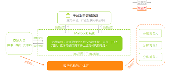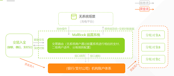 通过调用API接口,实现平台业务交易系统与分账系统的数据交互,将支付订单和分账规则上送到监管机构记账账户体系,就可实现与设备方、运营方、物业方等多方智能分账,一般T1自动结算到实体银行账户。
