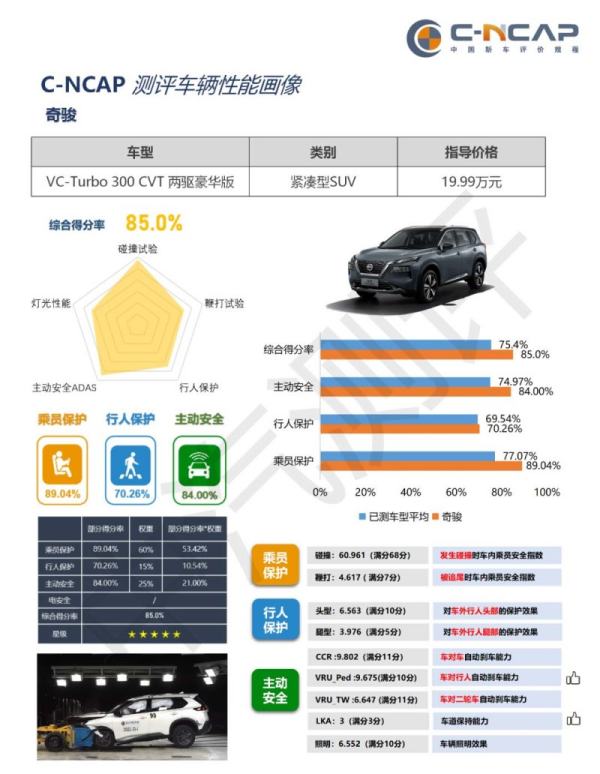 经中汽中心评测管理中心审核,东风日产奇骏VC-Turbo 300 CVT两驱豪华版车型综合得分率为85.0% ,达到C-NCAP“五星级”。