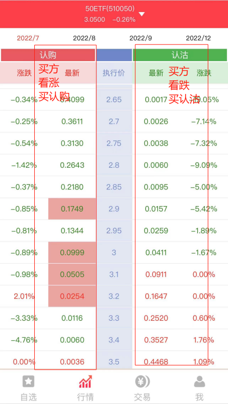 2.认购认沽方向选择:若看好50ETF后市上涨,则买入当月认购期权。若看好50ETF后市下跌,则买入当月认沽期权。