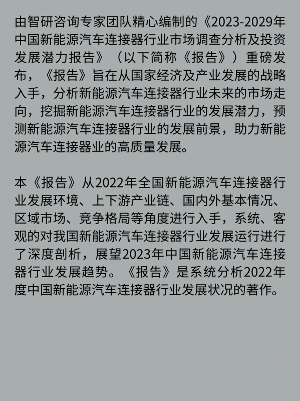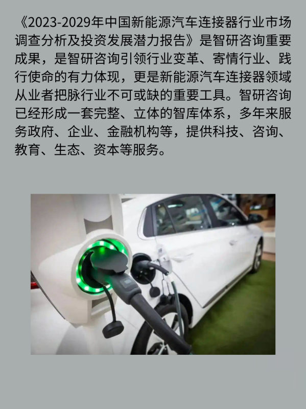 由智研咨询专家团队精心编制的《2023-2029年中国新能源汽车连接器行业市场调查分析及投资发展潜力报告》(以下简称《报告》)重磅发布,《报告》旨在从国家经济及产业发展的战略入手,分析新能源汽车连接器行业未来的市场走向,挖掘新能源汽车连接器行业的发展潜力,预测新能源汽车连接器行业的发展前景,助力新能源汽车连接器业的高质量发展。
