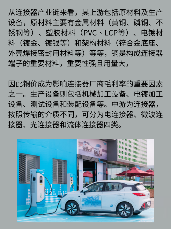 因此铜价成为影响连接器厂商毛利率的重要因素之一。生产设备则包括机械加工设备、电镀加工设备、测试设备和装配设备等。中游为连接器,按照传输的介质不同,可分为电连接器、微波连接器、光连接器和流体连接器四类。