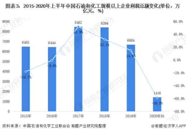2015-2020年上半年,中国石油和化工规模以上企业利润总额呈现逐年下跌的趋势。据国家统计局数据,2019年中国石油和化工行业规模以上企业利润总额下降明显,为6683.7亿元,下降14.9%;2020年上半年,利润总额1416.1亿元,下降58.8%。