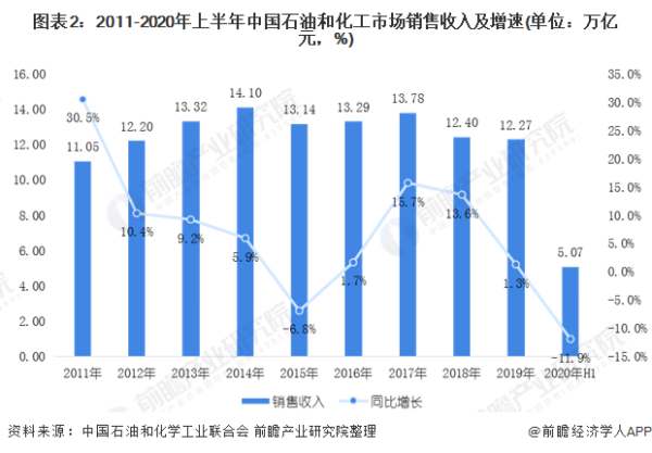 随着我国宏观经济下行压力不断加大,我国石油和化工行业规模以上企业营业收入增长趋缓。2019年中国石油和化工行业规模以上企业营业收入12.27万亿元,增长1.3%;受疫情影响,2020年上半年,我国石油和化工行业营业收入5.07万亿元,下降11.9%。