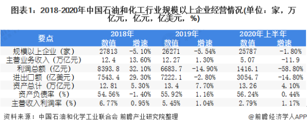 中国石油和化学工业联合会发布《2019年中国石油和化学工业经济运行报告》显示,截至2019年12月末,石油和化工行业规模以上企业26271家,2019年,石油和化工行业营业收入12.27万亿元,同比增长1.3%;利润总额6683.7亿元,同比下降14.9%,分别占全国规模工业营业收入的11.6%和10.8%。2019年,石油和化工行业进出口总额7222.1亿美元,同比下降2.8%。资产总计13.40万亿元,同比增长7.7%;资产负债率55.92%,同比上升1.16个百分点;亏损企业亏损额1320.8亿元,同比扩大9.7%;行业亏损面达17.6%。2019年,全行业营业收入利润率为5.45%,同比下降1.04个百分点;每100元营业收入成本82.67元,同比上升1.39元。