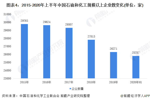 2015-2020年上半年,中国石油和化工规模以上企业数呈现逐年下跌的趋势。据国家统计局数据,截至2019年底,石油和化工行业规模以上企业26271家,同比减少了5.54%。截至2020年6月末,石油和化工行业规模以上企业25787家。