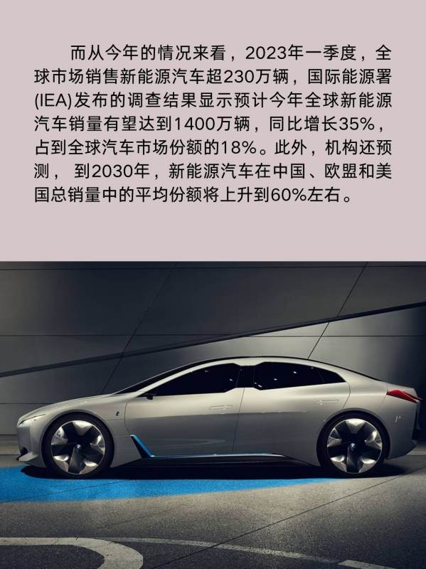 而从今年的情况来看,2023年一季度,全球市场销售新能源汽车超230万辆,国际能源署(IEA)发布的调查结果显示预计今年全球新能源汽车销量有望达到1400万辆,同比增长35%,占到全球汽车市场份额的18%。此外,机构还预测,到2030年,新能源汽车在中国、欧盟和美国总销量中的平均份额将上升到60%左右。
